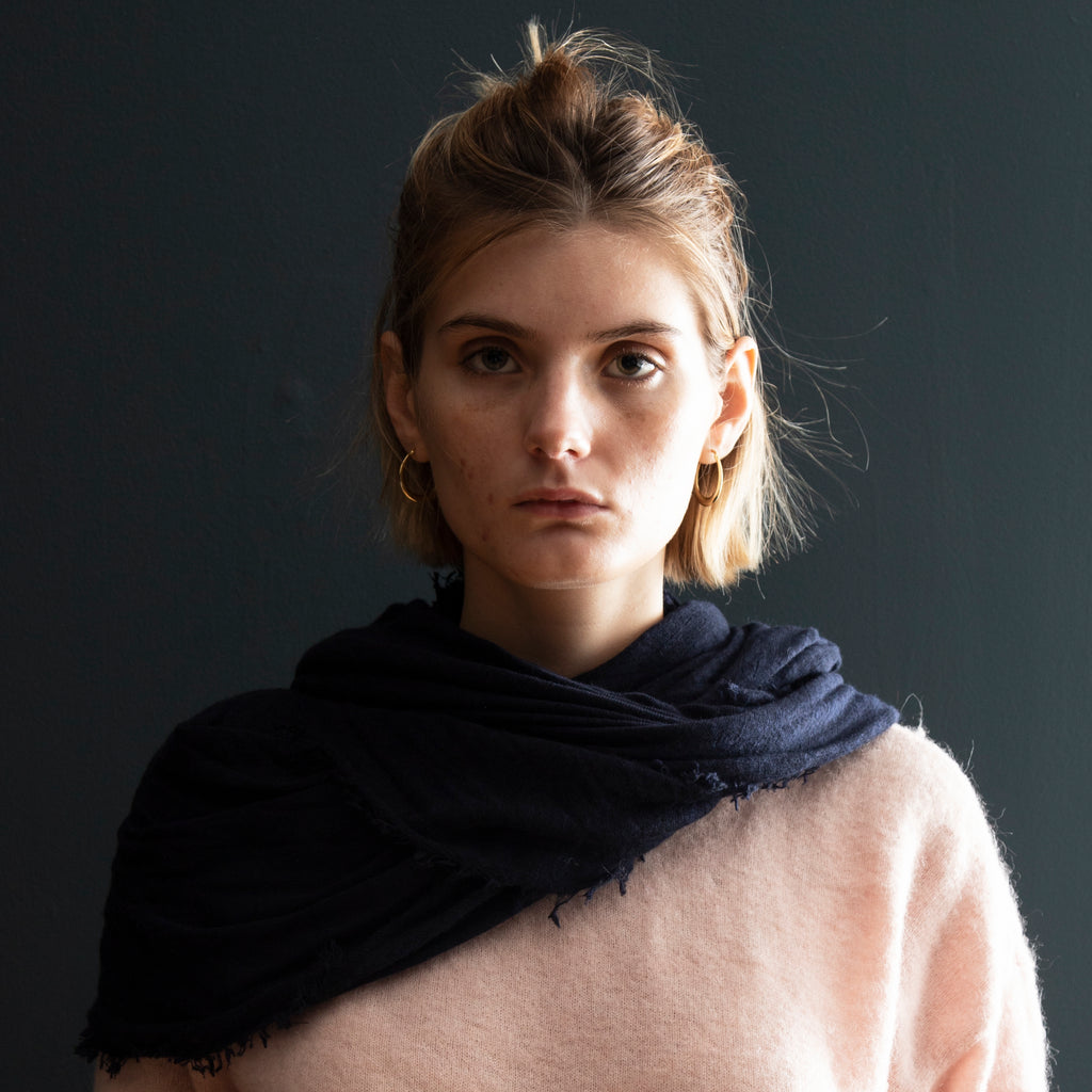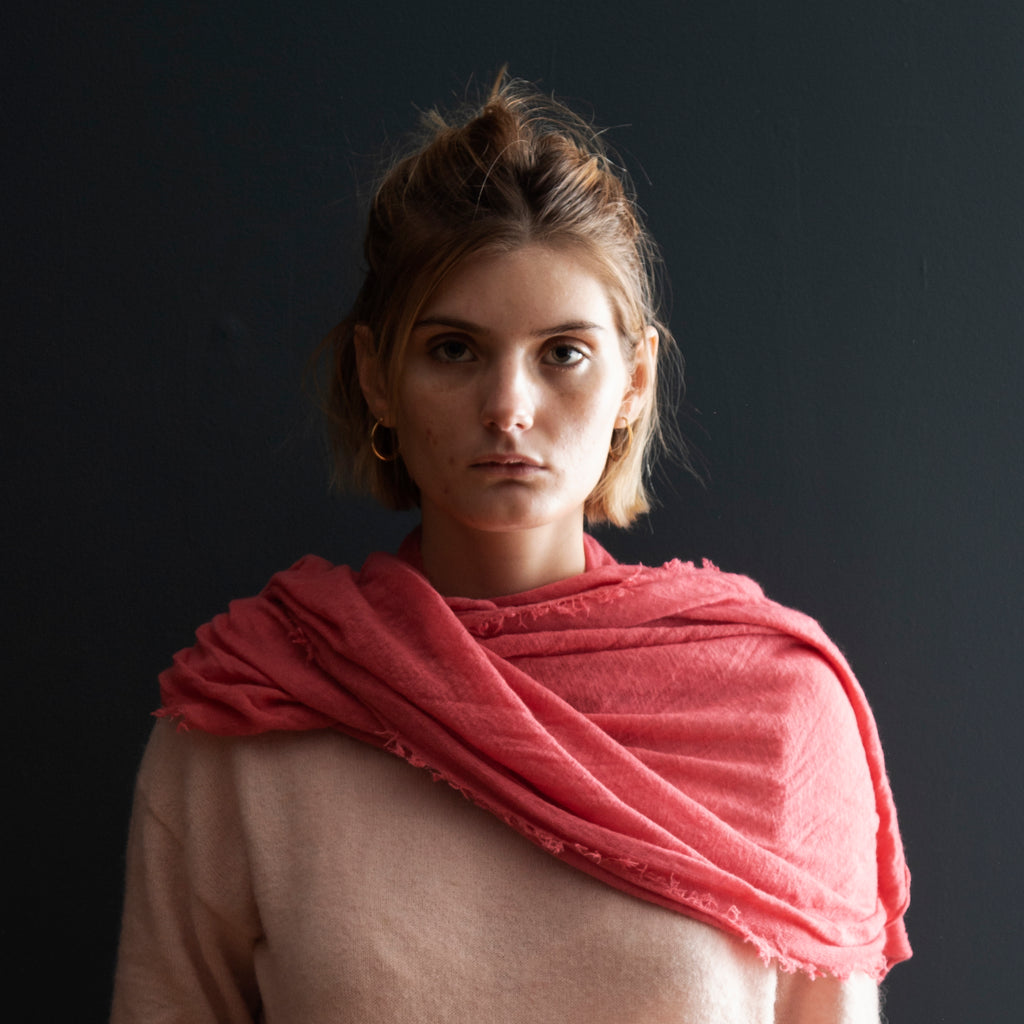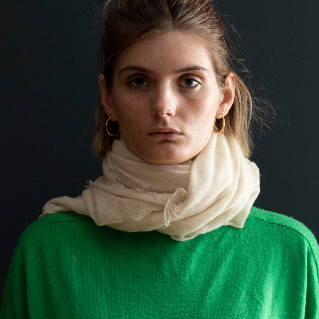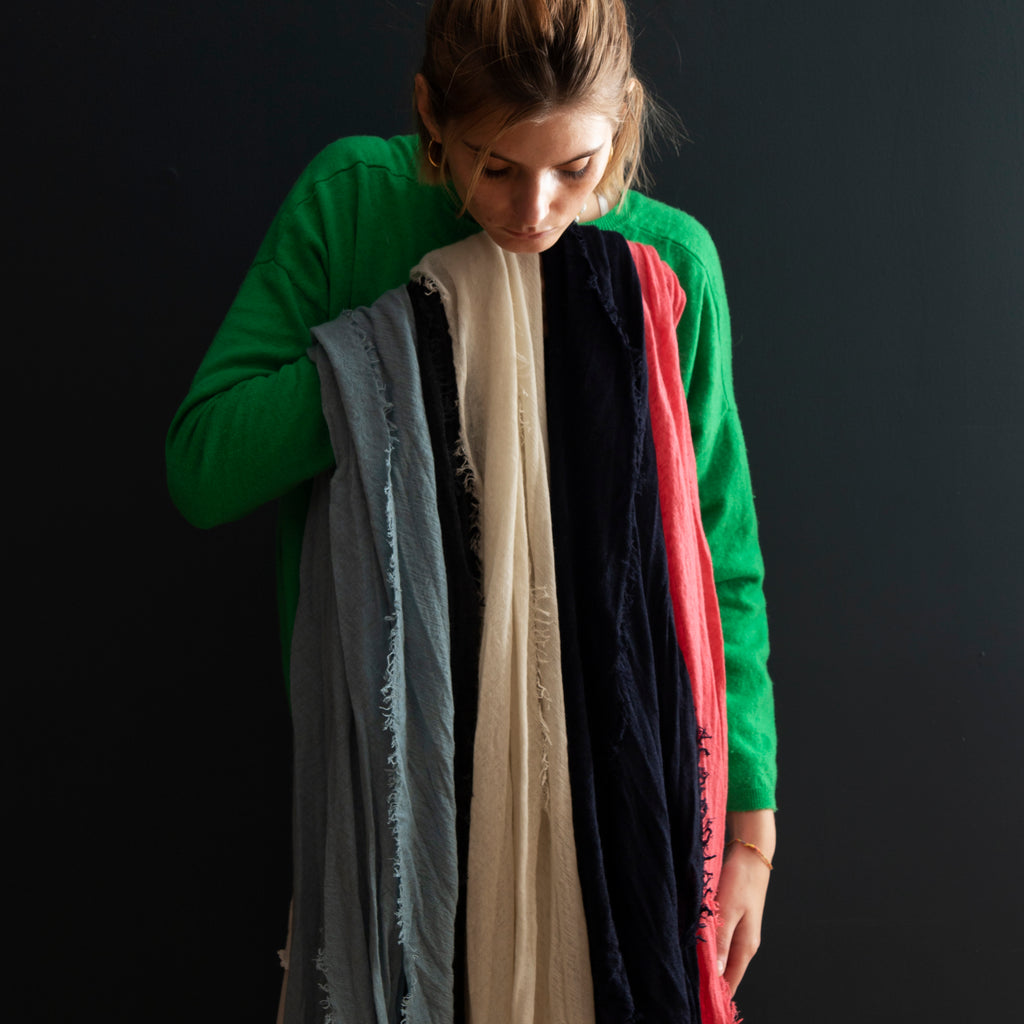 The ultimate in luxury and melt-in-your-hand texture, Grisal's Love scarves are knit on the bias, are oblong and have distressed edges. They look wonderful when worn loose, left to fall where they please.