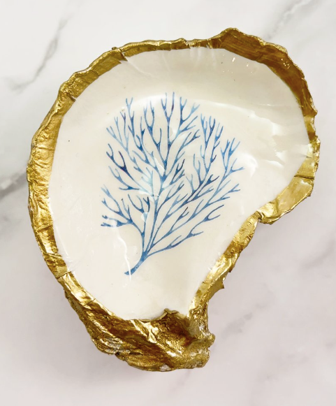 The Gilded Seascapes Collection of Decoupage Oyster Jewelry Dishes are perfect for the beach lover or addition to your coastal decor. This collaborative line features Laura Lobdell of Printed Hues inspiring watercolor works on Grit & Grace’s Gilded Oyster Ring Dishes. Every decoupage oyster dish is one-of-a-kind, made from recycled oyster shells, and measures approximately 3.5” by 2.5”.