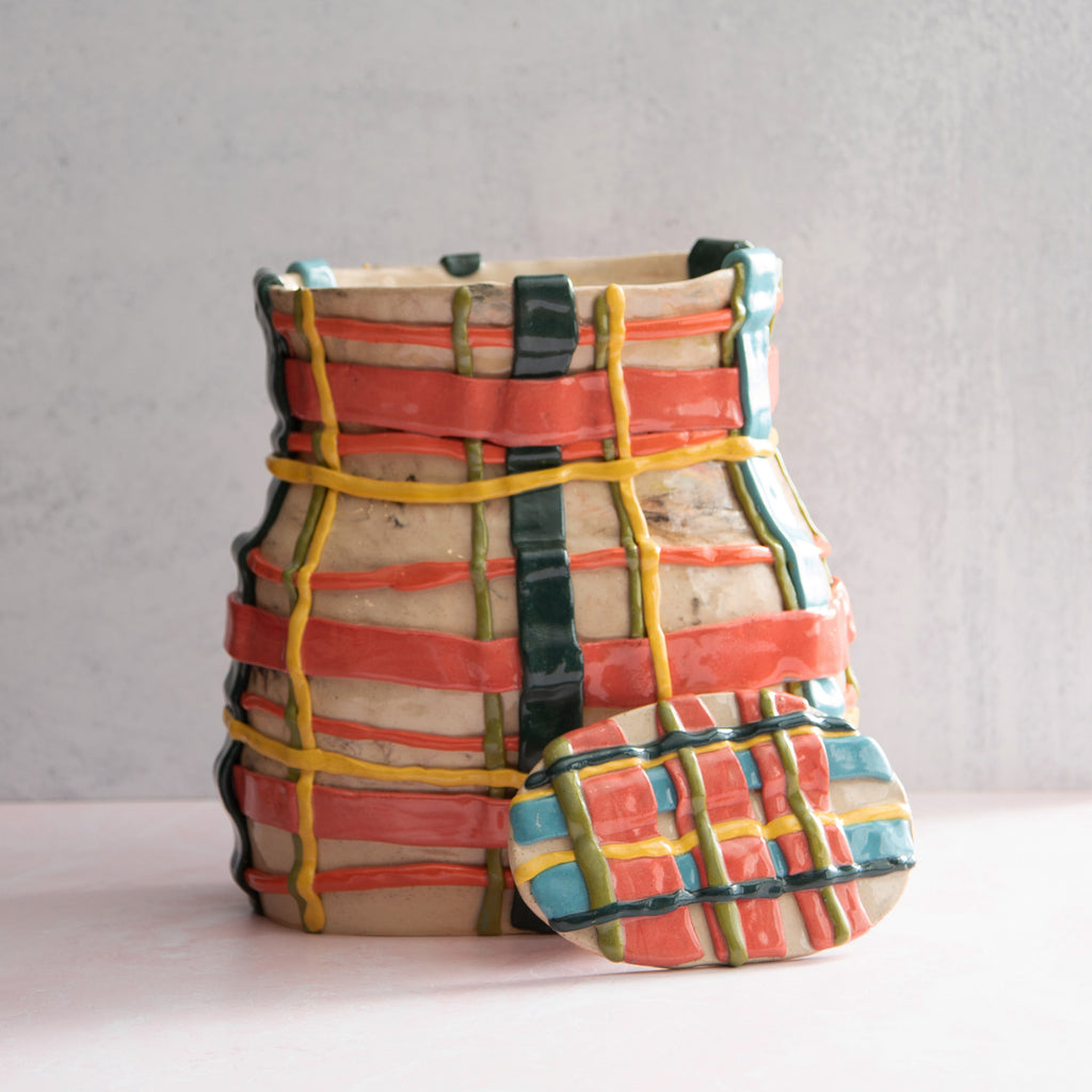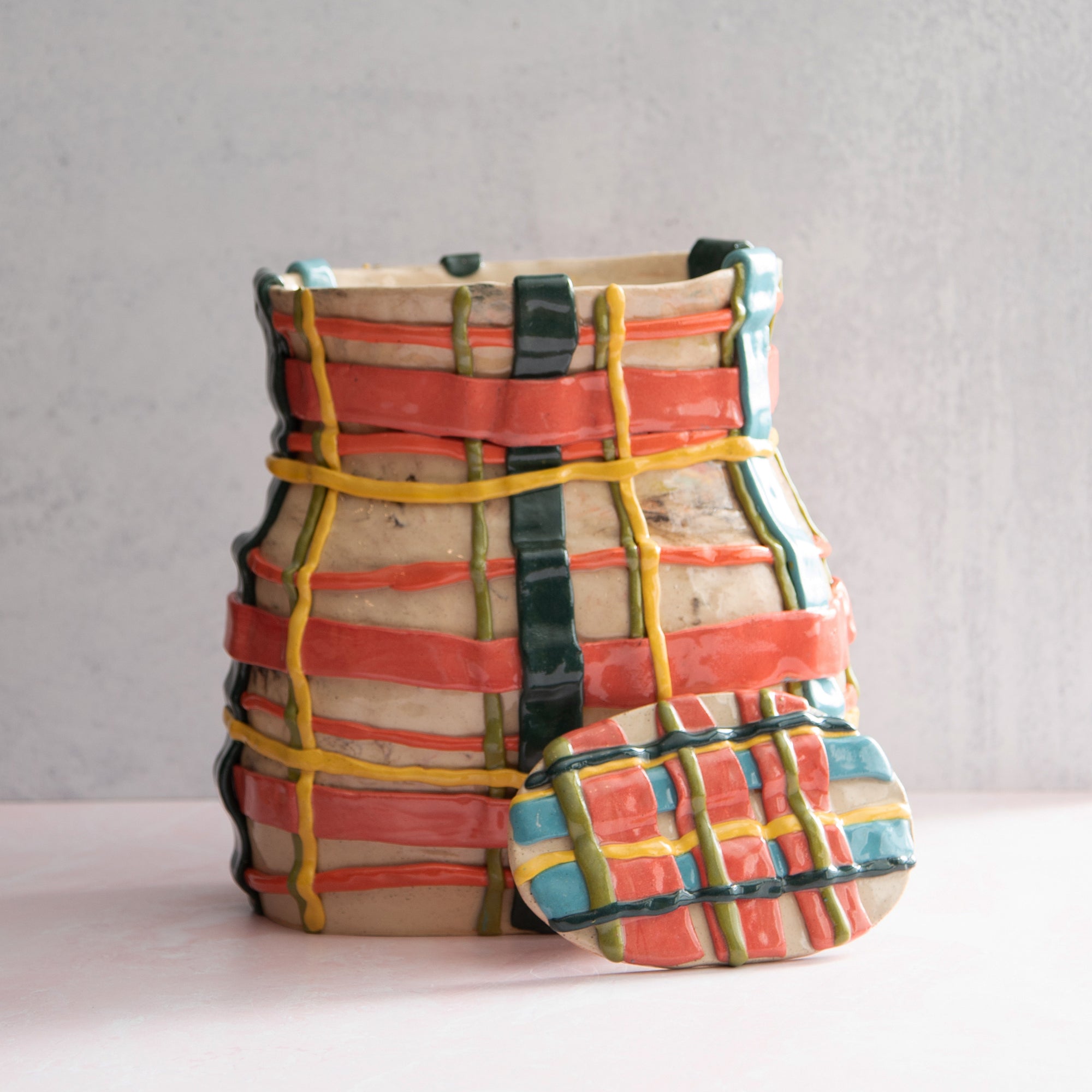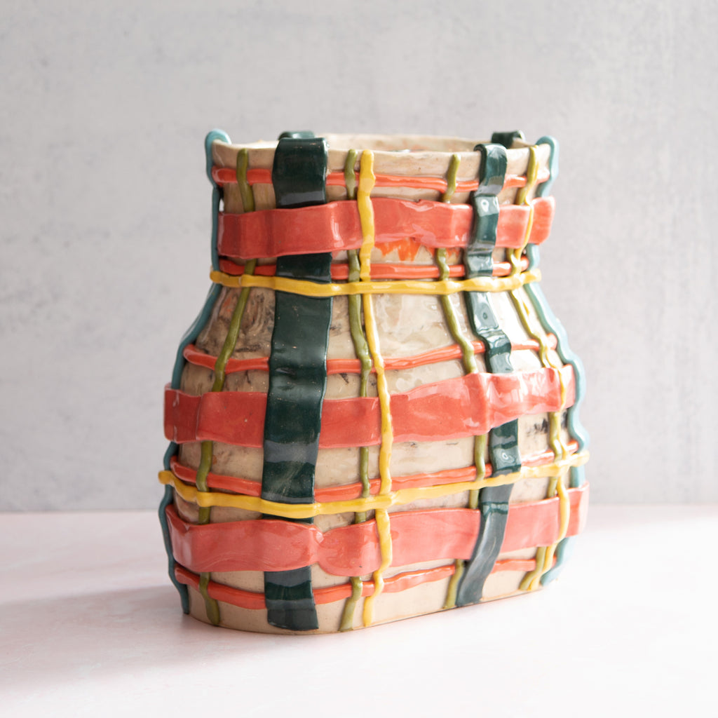 Corinna Cowles’ work — pockets, pillows, paintings, curtains, wallpaper, and drapes in addition to ceramic work — is inspired by clothing and decorative patterns, engaging the viewer with absurd dislocations and transformations. Domestic life, craft, sculpture, identity, and class all seep out from a porous, multi-material plane of grids, loops, and abstractions of the everyday. The pieces she makes for Sparrow are representative of her latest work: handbuilt vessels focusing on experimentation and cycles of renewal, radiating with pops of color from custom-pigmented clays, underglazes, and glazes. Corinna currently lives and works in Philadelphia, PA.